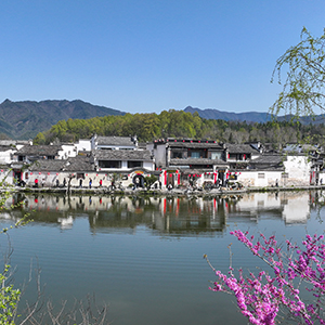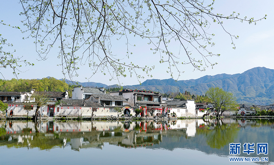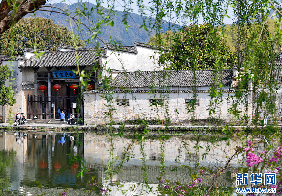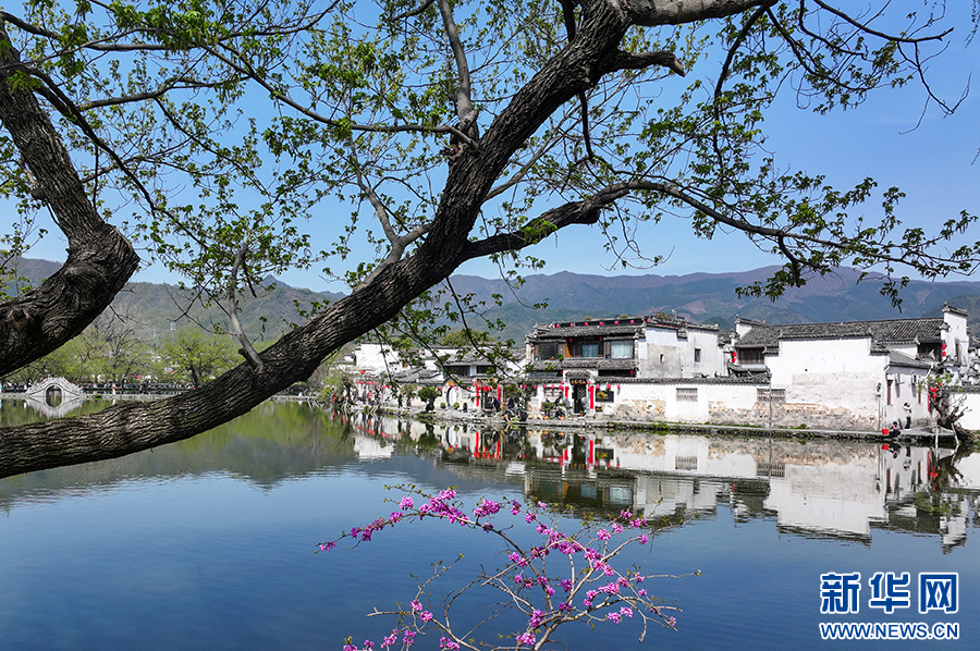 当日,世界文化遗产地安徽省黄山市黟县宏村古村落一派春意盎然的景象,紫荆花开,垂柳吐绿,众多游客来此亲近自然,感受美好春光。新华网发(施亚磊 摄)
