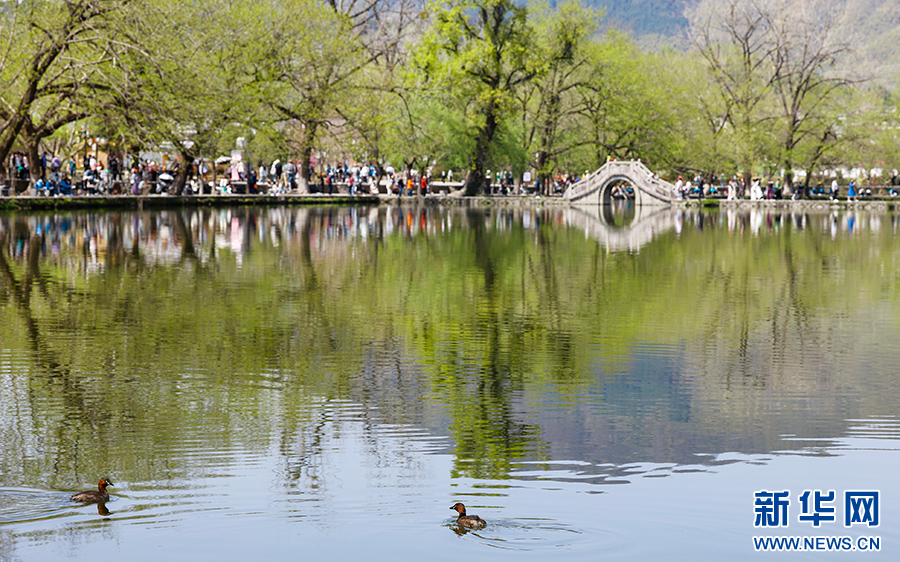 4月2日,游客在黟县宏村欣赏春日美景。