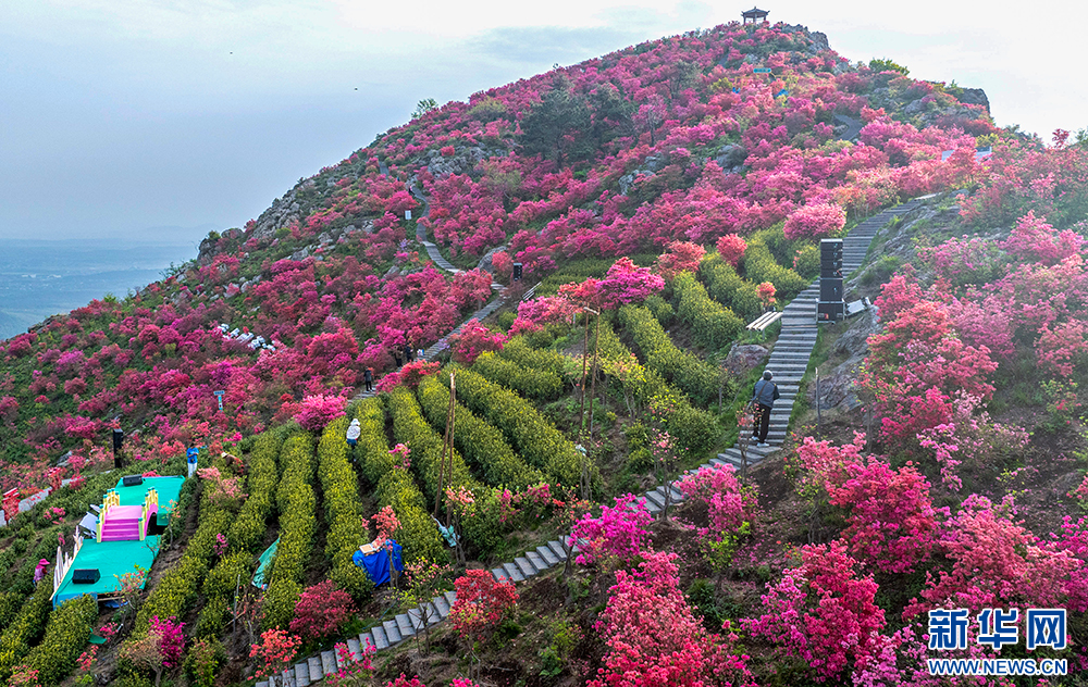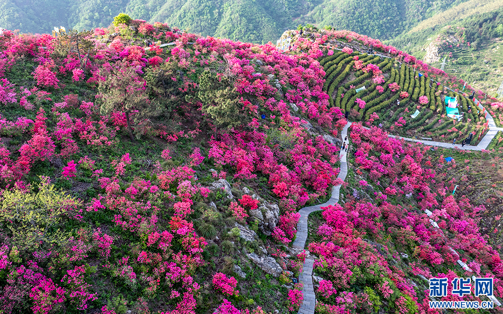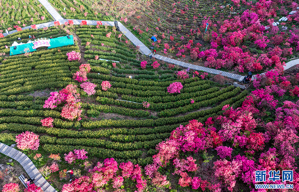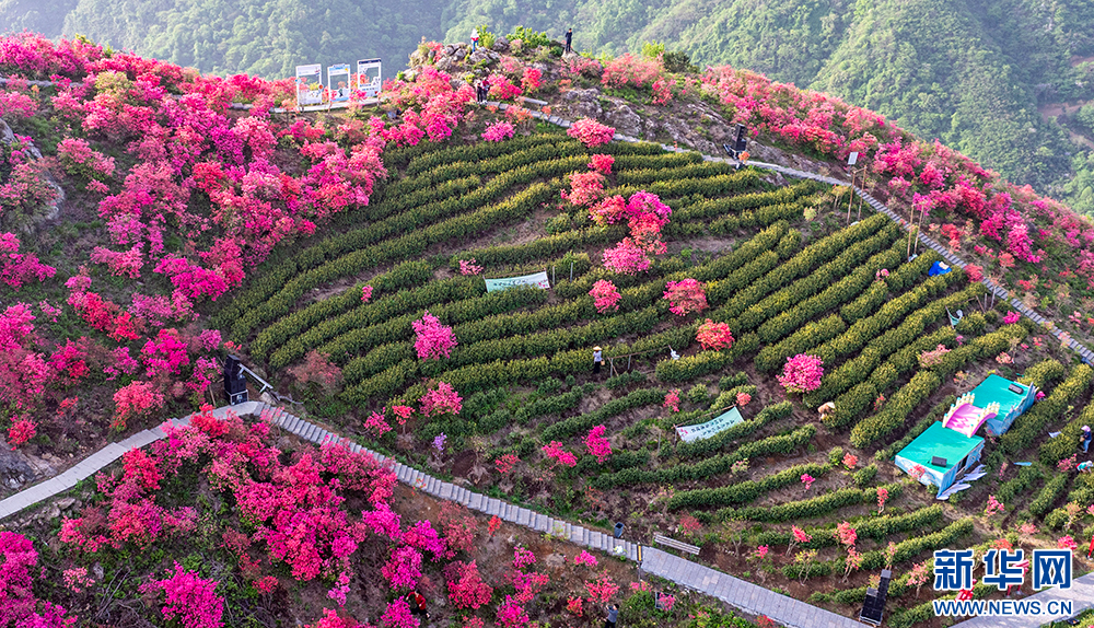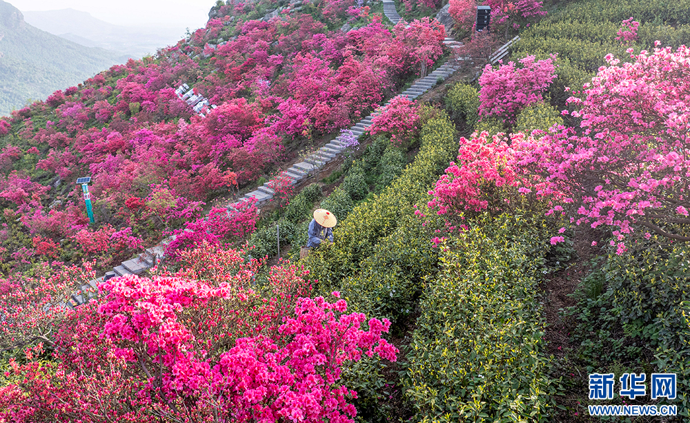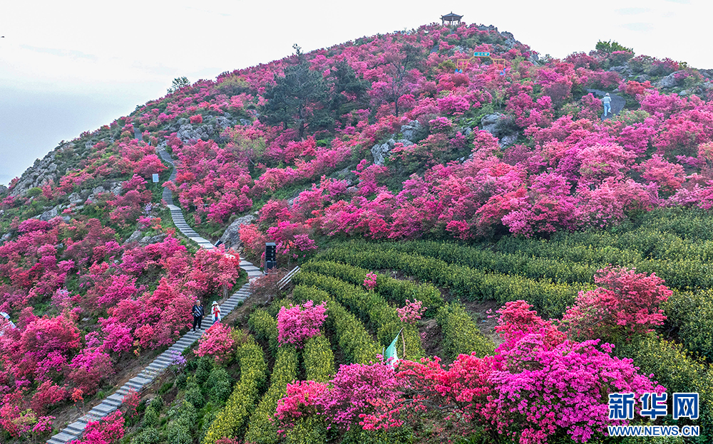 安徽省无为市昆山镇三公山茶叶种植基地,高山杜鹃在翠绿的茶园间绽放,美不胜收(4月10日摄)。