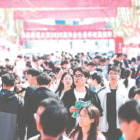 日前,淮北师范大学2025届毕业生春季校园招聘会在相山校区举办,大学生在了解岗位信息。本报通讯员 万善朝 摄