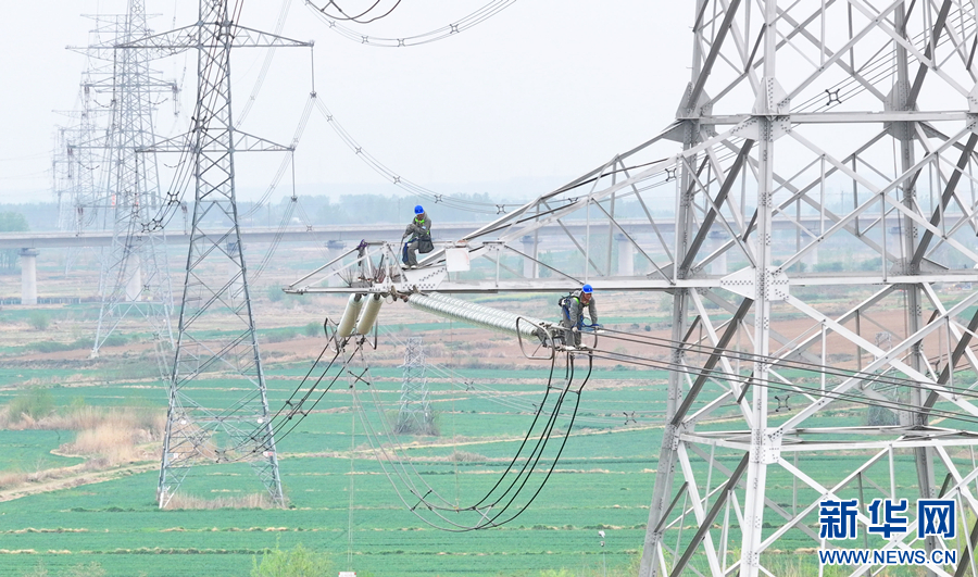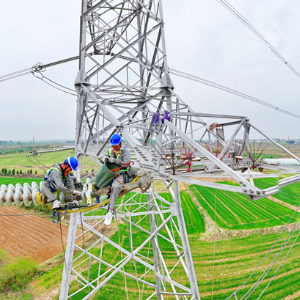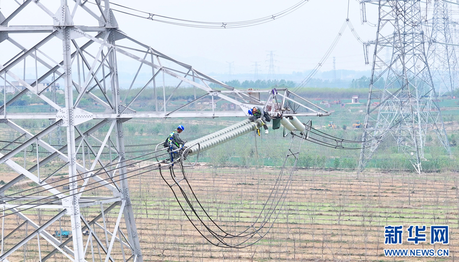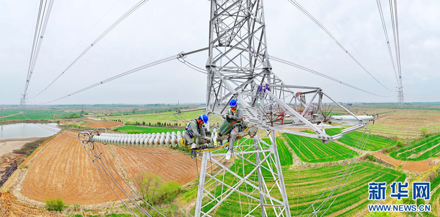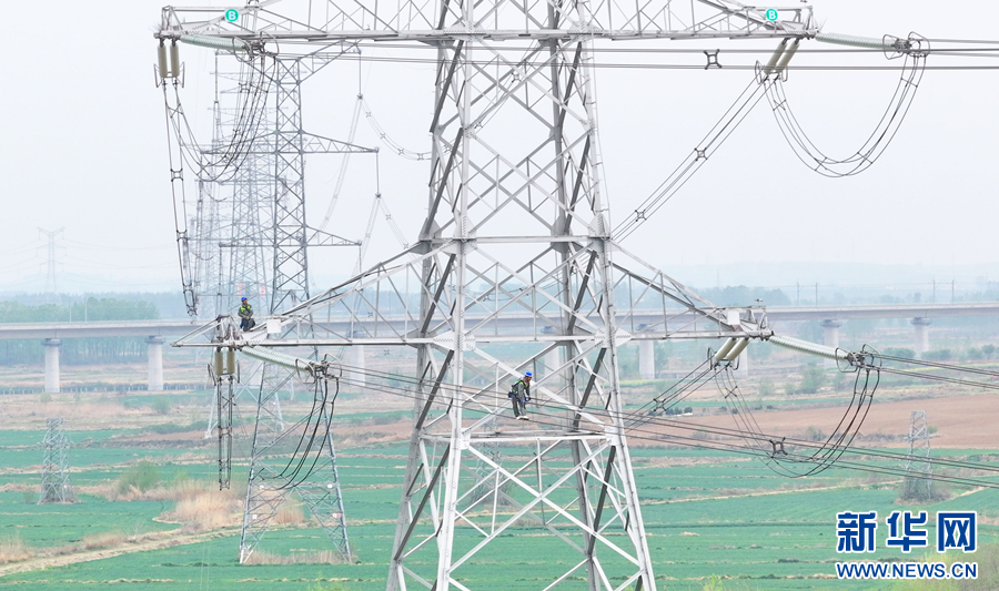 近日,在安徽省滁州市定远县池河镇青岗村境内,检修人员在80多米高空对500千伏朗峰至清流变电站特高压输电线路进行综合检修作业,及时消除电网安全隐患,提高设备健康水平,确保电网“迎峰度夏”期间安全供电。新华网发(宋卫星 摄)