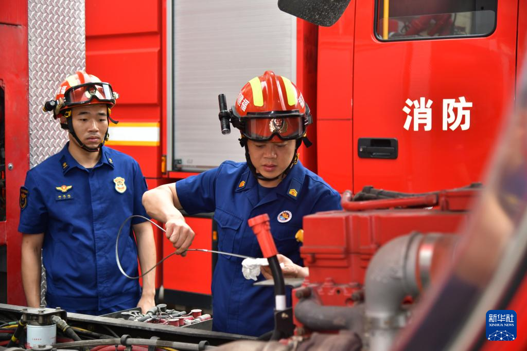 5月1日,在福建省福州市消防救援支队特勤大队二站,消防员在检查消防车辆。