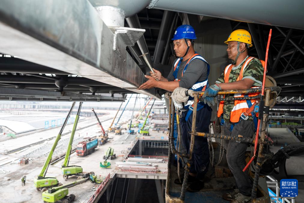 5月1日,云南机场建设发展有限公司建筑工人在昆明长水国际机场T2航站楼项目工地作业。
