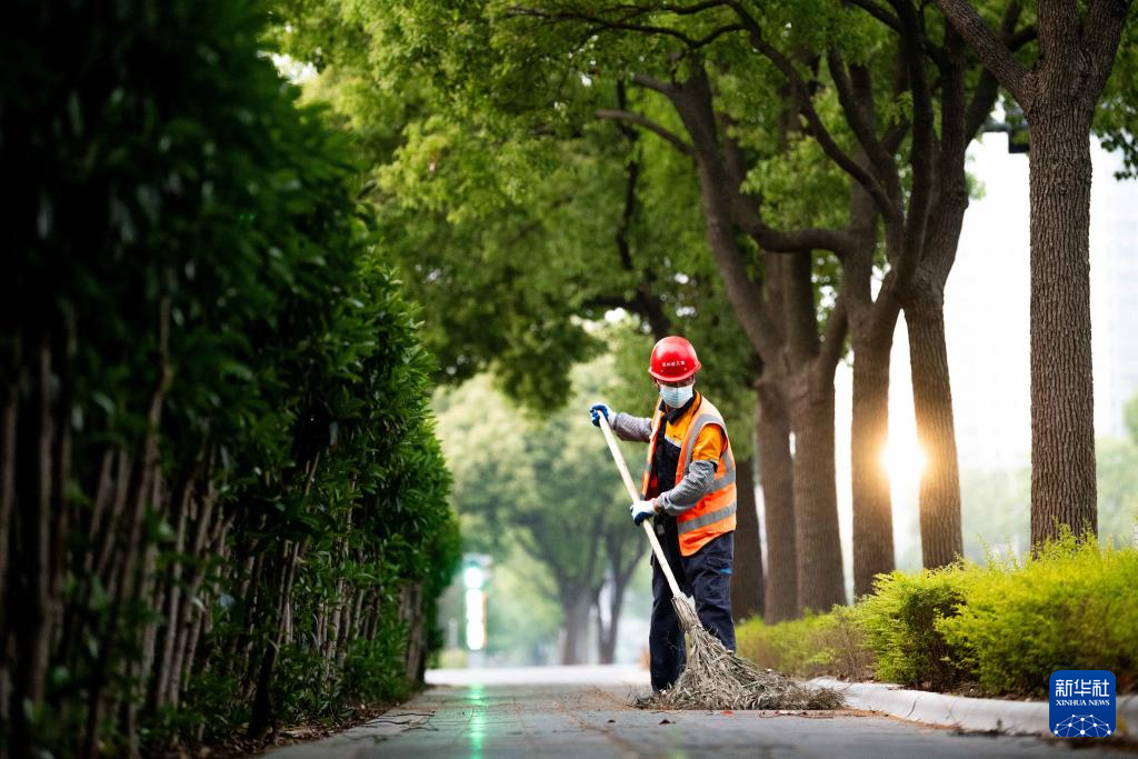 5月1日,环卫工人在江苏省泰州市海陵区海陵南路清扫街道。