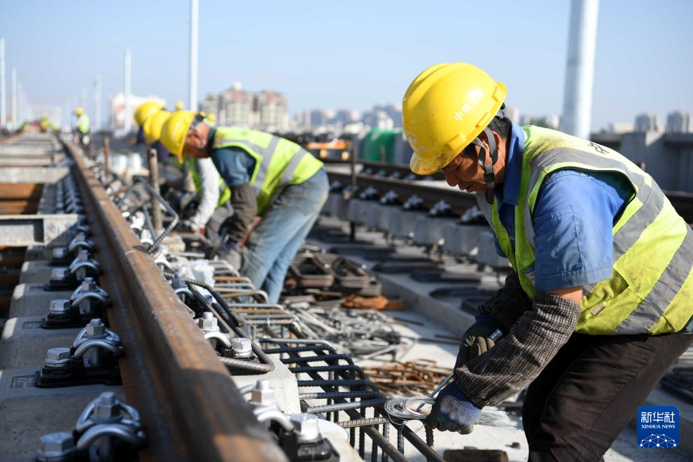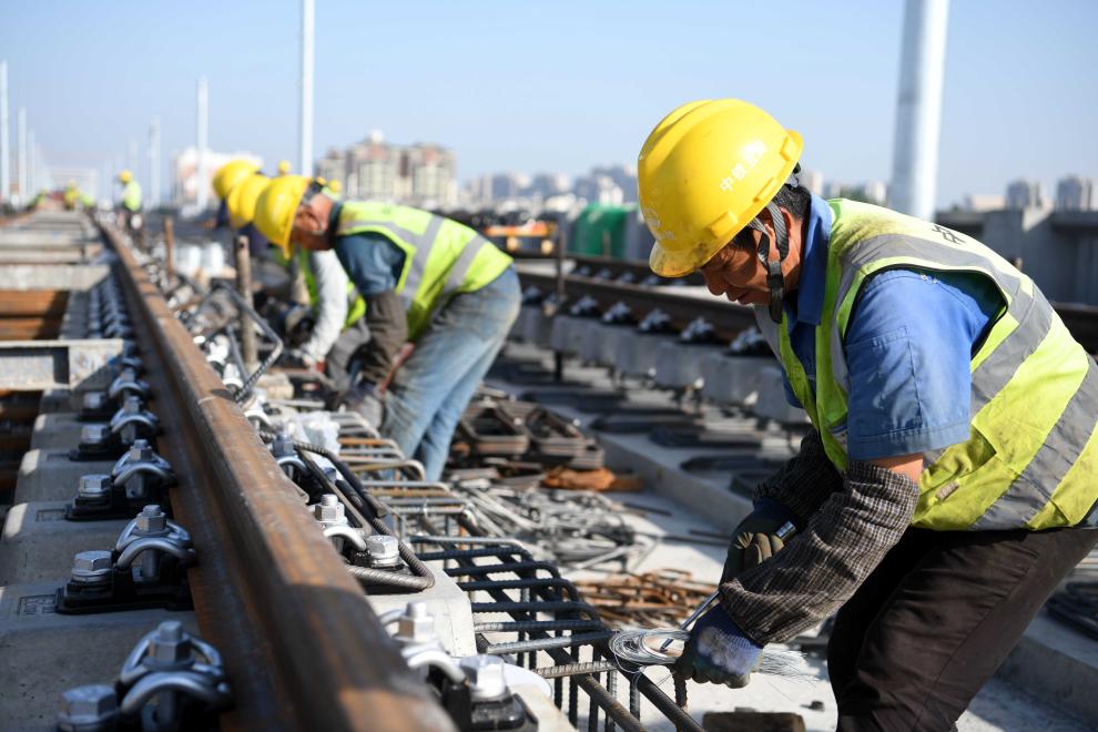 5月1日,工人在位于西安市阎良区的中铁十一局西延高铁铺轨基地作业。