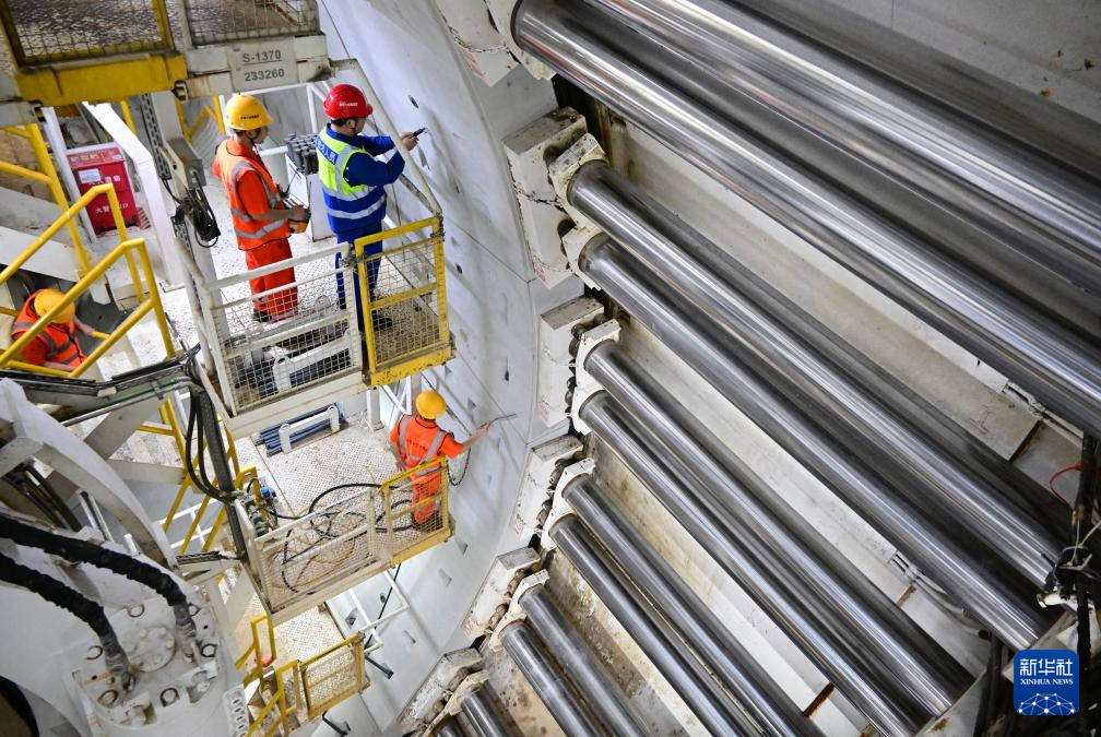 5月1日,在青岛胶州湾第二隧道盾构掘进现场,中铁十四局建设者测量管片拼装精度。