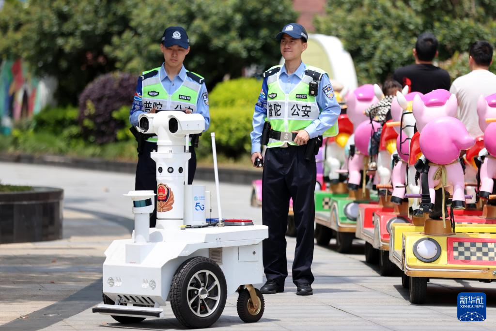 5月1日,浙江省舟山市公安局普陀区分局东港派出所民警带领“5G机器人”在辖区商圈里巡逻。
