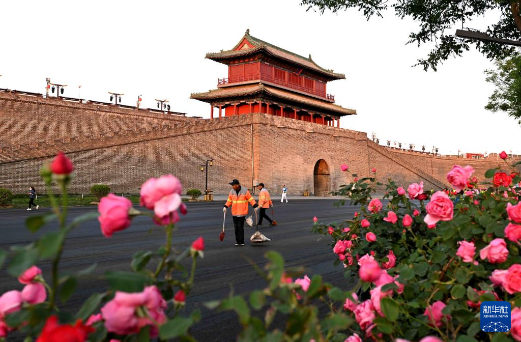 5月1日清晨,环卫工人在河北省石家庄市正定古城南城门进行路面清扫工作。
