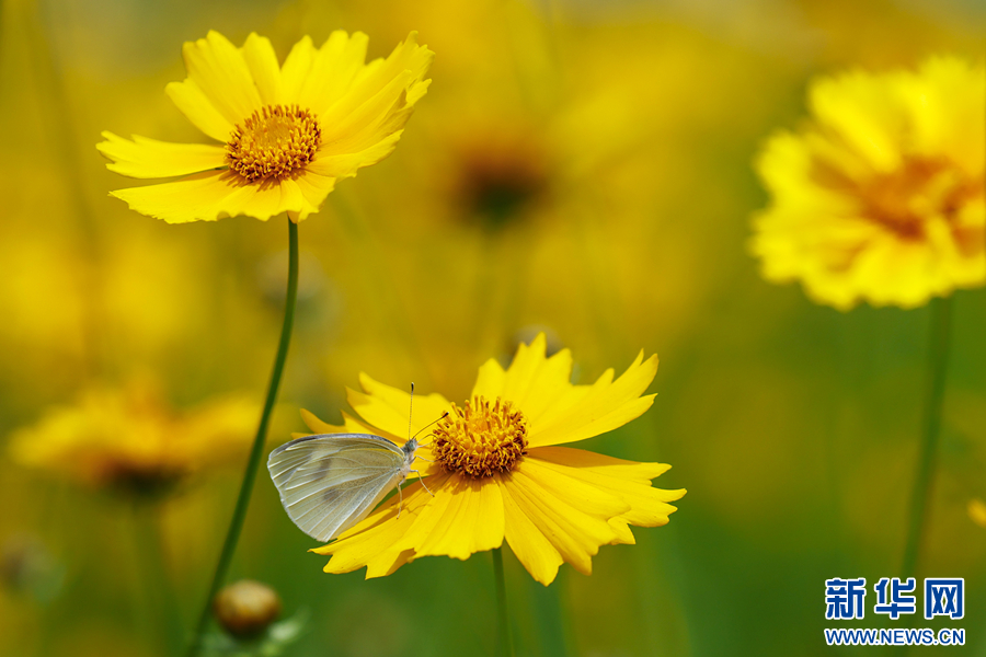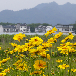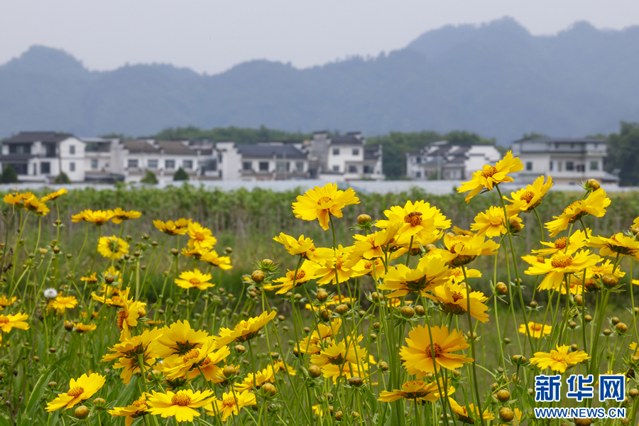 初夏时节,安徽省黄山市徽州区西溪南镇乡村道路旁的金鸡菊花渐次绽放,娇艳欲滴,扮靓徽州田园风景。