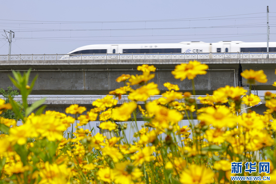 5月6日,列车从安徽省黄山市徽州区西溪南镇的金鸡菊花海旁经过。
