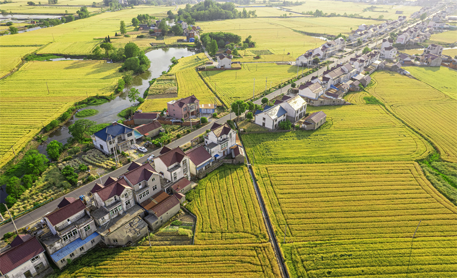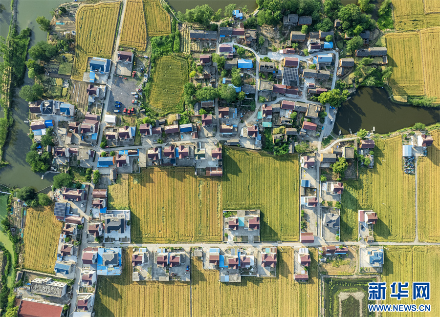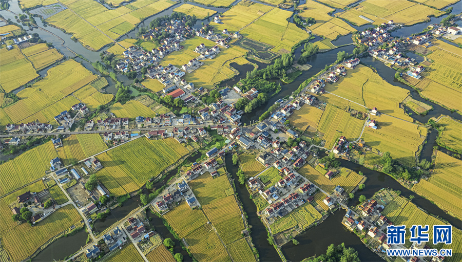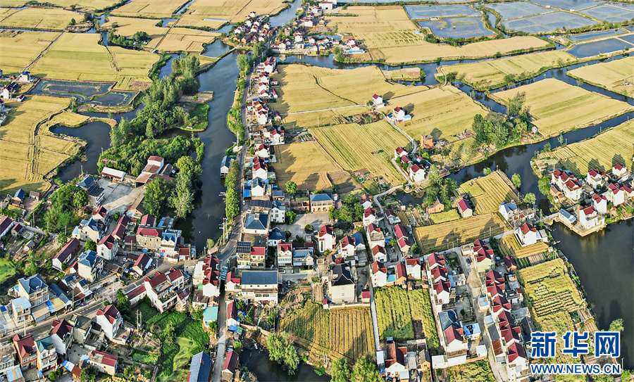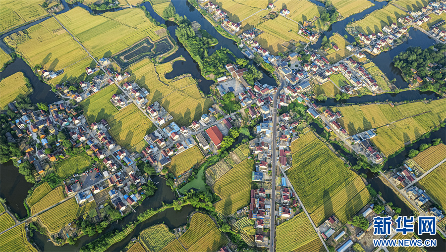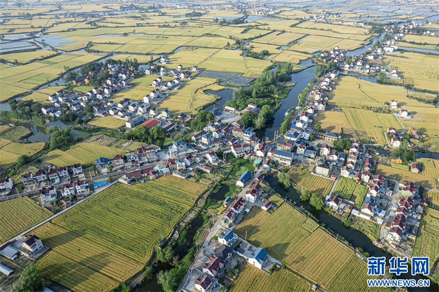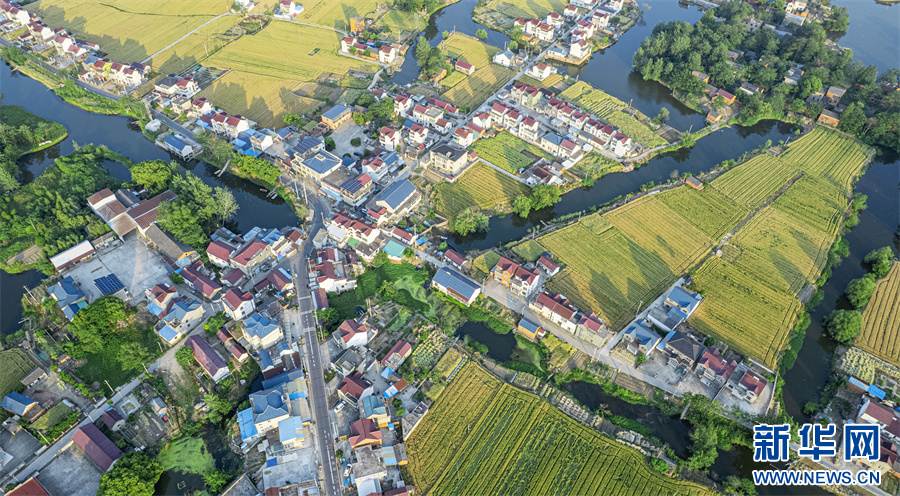 5月11日,航拍安徽省马鞍山市当涂县护河镇清潭村,金黄的麦田与村庄、河流、道路相映成景,构成一幅美丽的田园生态画卷。