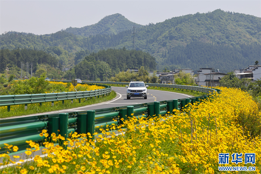 初夏时节,安徽省黄山市休宁县溪口镇石田村景美如画,“四好农村路”015县道旁的金鸡菊花在阳光的照耀下,璀璨夺目,扮靓夏日乡村。