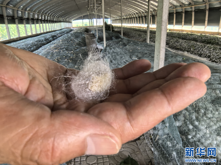 5月16日,养蚕工人展示养殖的桑蚕。新华网汤阳 摄
