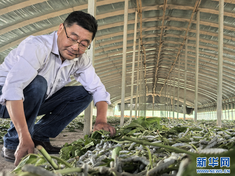 5月16日,肥西县金牛蚕桑农民专业合作社负责人赵启华在查看桑蚕生长情况。新华网汤阳 摄