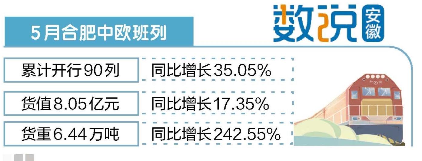 6月10日,记者从合肥海关获悉,5月合肥中欧班列累计开行90列,同比增长35.05%;货值8.05亿元,同比增长17.35%;货重6.44万吨,同比增长242.55%。