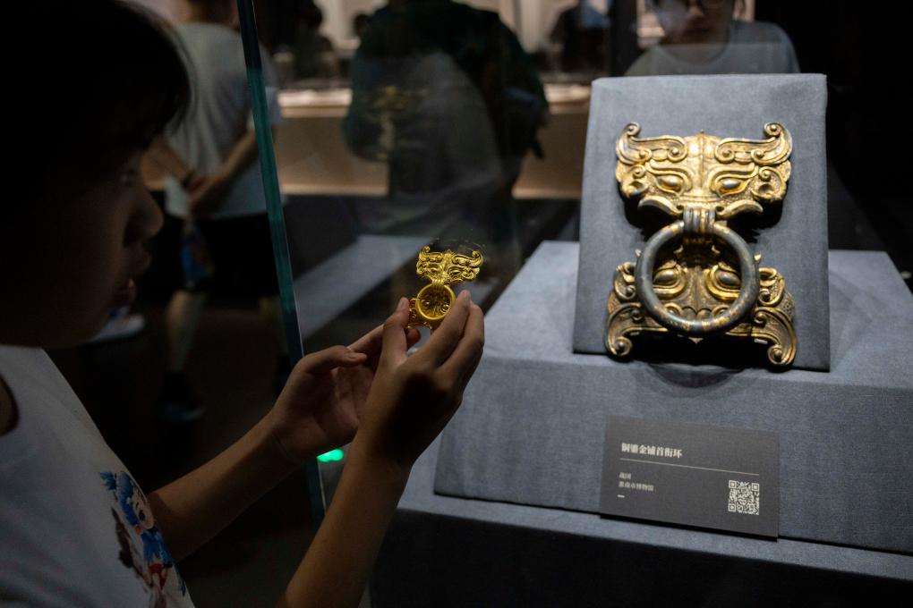 6月15日,在上海市闵行区博物馆,小朋友手持购买的文创产品在铜鎏金铺首衔环前比对。