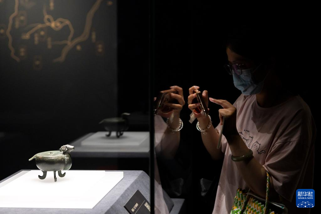 6月15日,在上海市闵行区博物馆,观众拍摄附盖三足羊形铜尊。