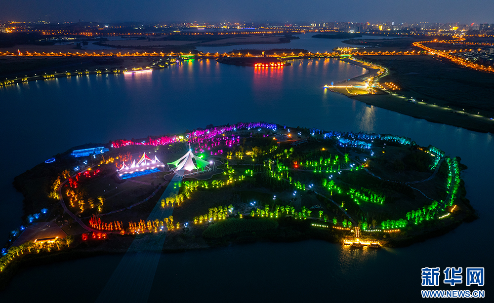 近日,航拍华灯初上的安徽省淮北市绿金湖湿地公园。
