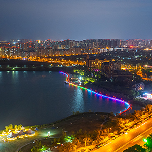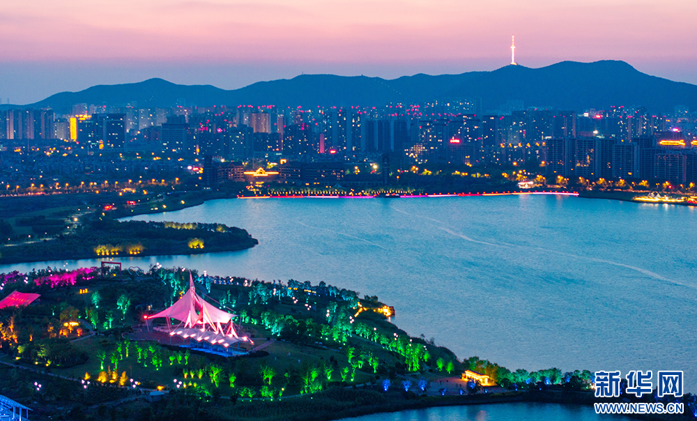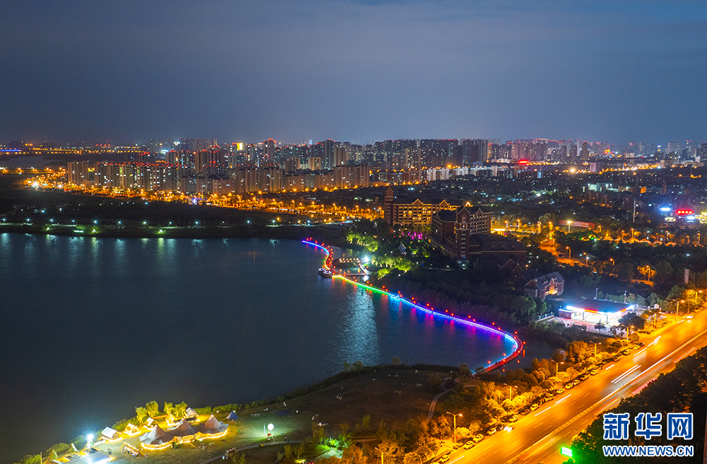 当夜幕降临,安徽省淮北市绿金湖波光粼粼,与沿岸璀璨灯火交相辉映,形成“半湖星辉半湖城”的景象,美不胜收。新华网发(王文 摄)