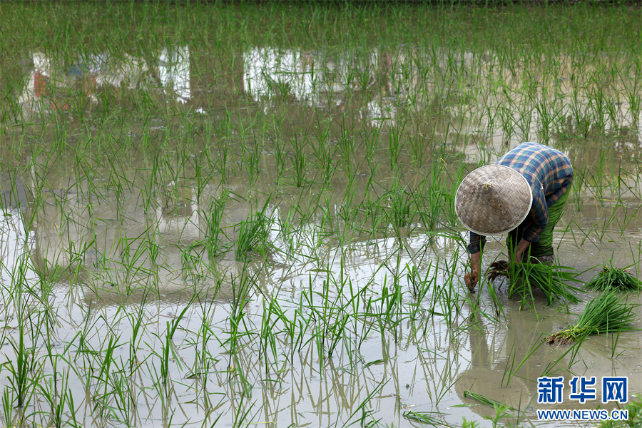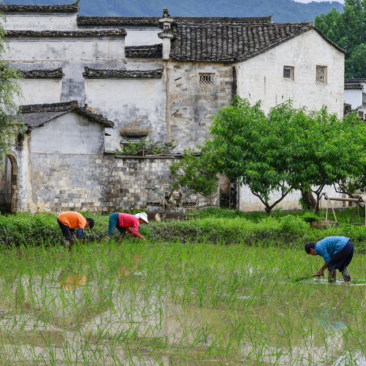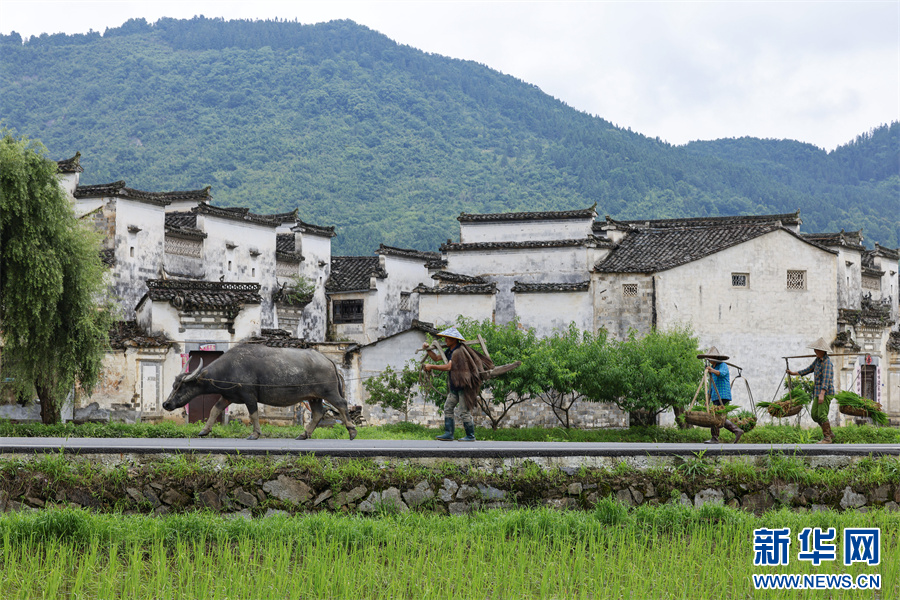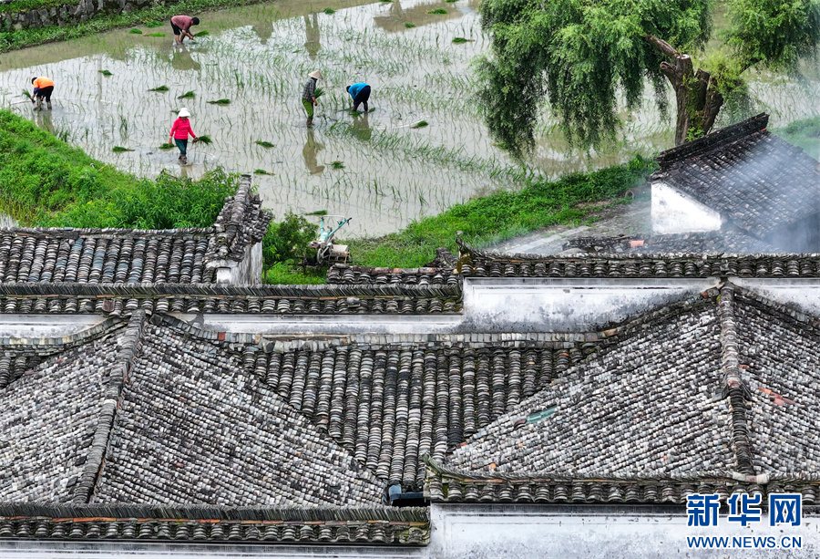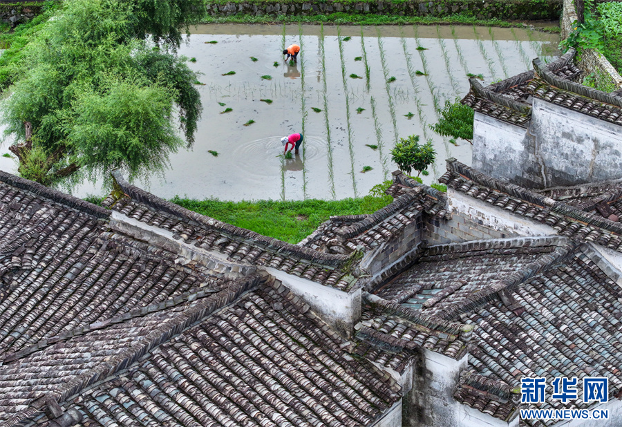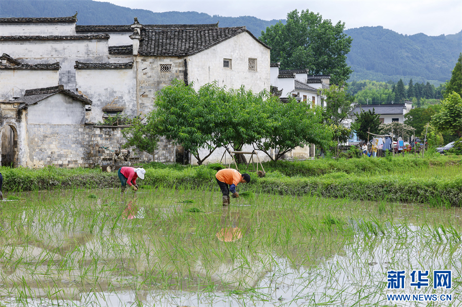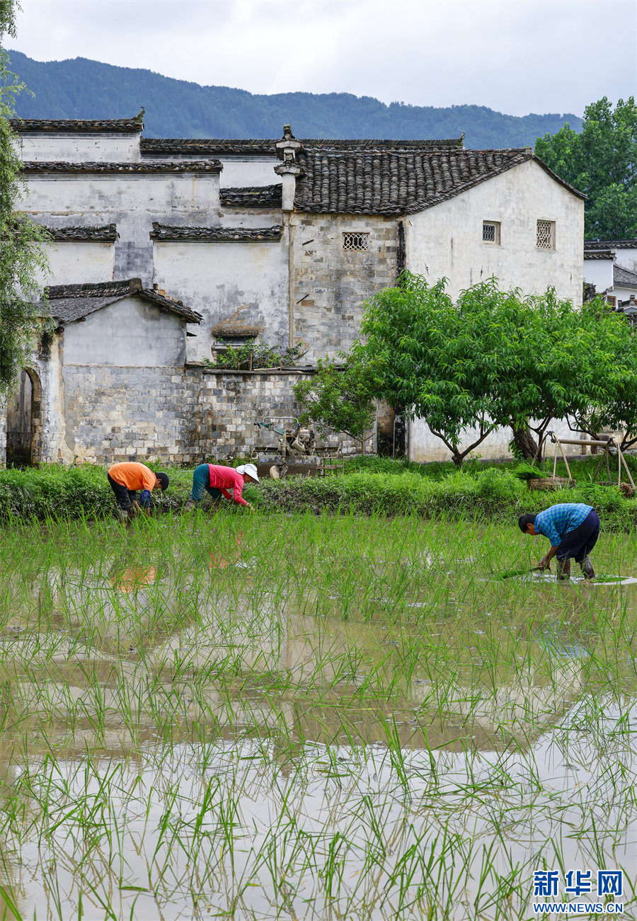 6月25日,在安徽省黄山市黟县碧阳镇关麓古村,村民在稻田里插秧。