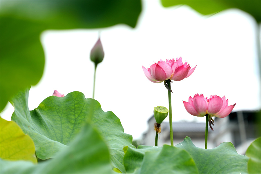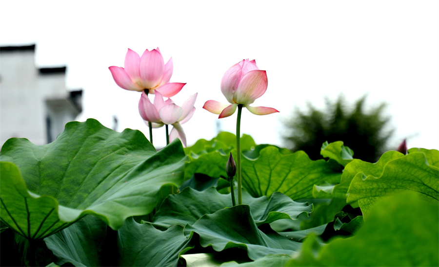 近日,黄山市徽州区潜口镇东山村百亩荷花盛开,游客慕名而来赏荷打卡。荷花与徽派建筑相互辉映,构成了一幅幅夏日乡村画卷。新华网发(吴建平 摄)