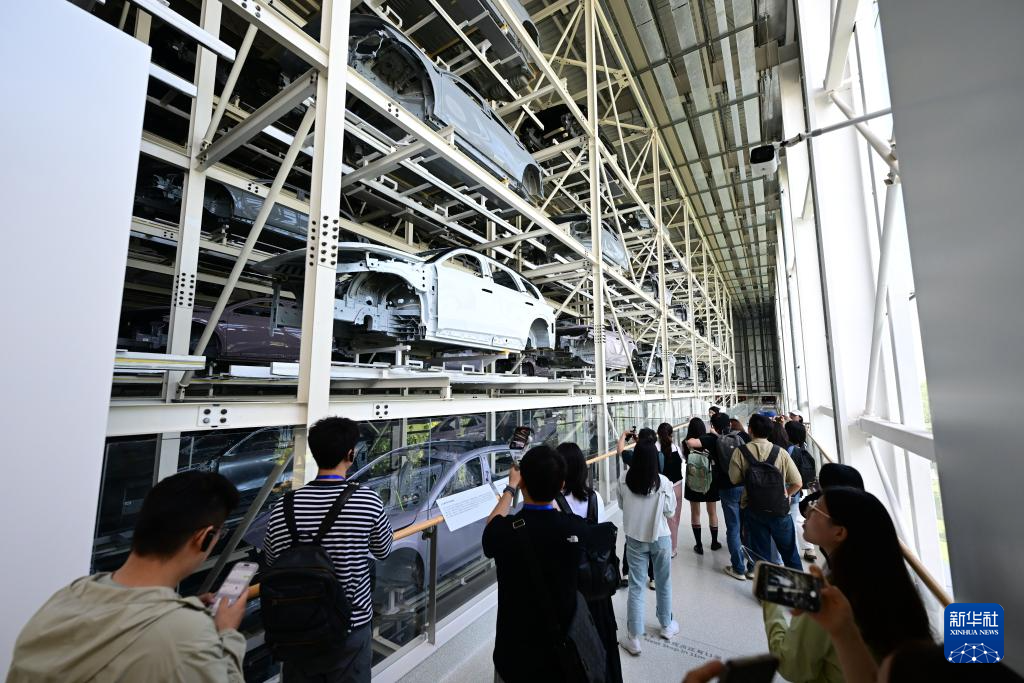 7月1日,在合肥市新桥智能电动汽车产业园蔚来第二工厂,媒体记者参观“魔方”车辆存取平台。新华社记者 周牧 摄