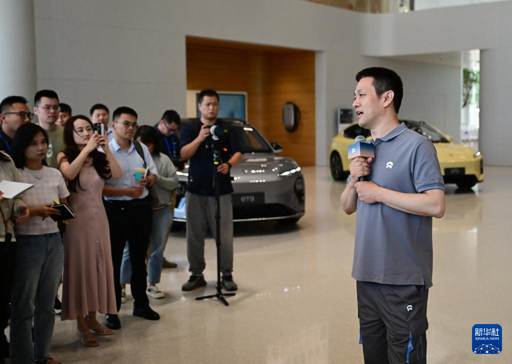 7月1日,在合肥市新桥智能电动汽车产业园蔚来第二工厂,媒体记者参观几款新能源汽车。新华社记者 周牧 摄