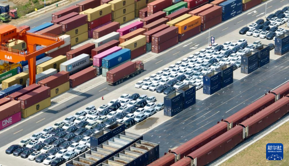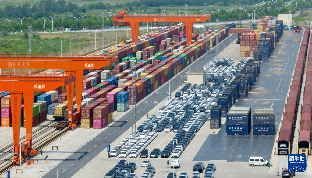 6月17日,在合肥派河港铁路物流基地等待装车出口的新能源汽车(无人机照片)。新华社记者 周牧 摄