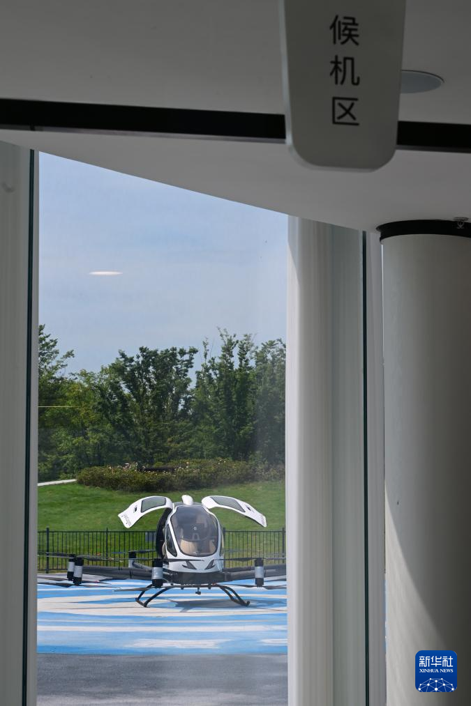 7月2日,在合肥骆岗公园,一架电动垂直起降飞行器(eVTOL)停放在充电机库中。