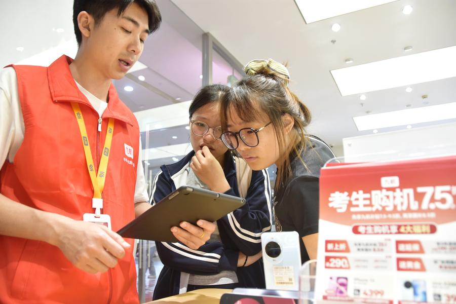 高考结束,“考后经济”潜能持续释放。记者在多家门店看到,不少学生在家长陪同下挑选电子产品,手机、电脑、平板、智能手表成为热门选项。多家门店推出“考生福利”,高考生凭准考证可领取专属优惠。