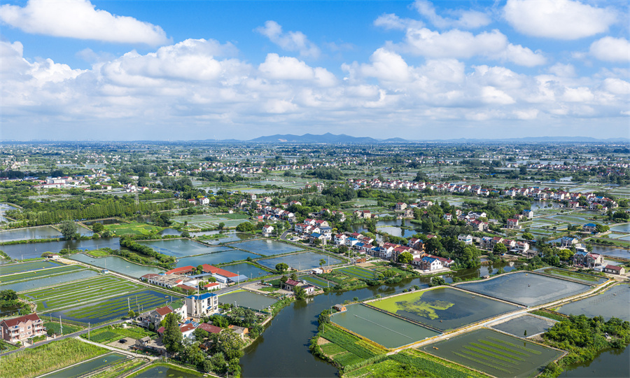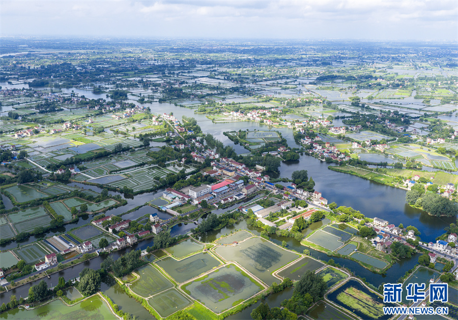 7月8日,航拍安徽省马鞍山市当涂县乌溪镇七房村,村庄、道路、水田纵横交错,构成了一幅美丽的和美乡村生态画卷。
