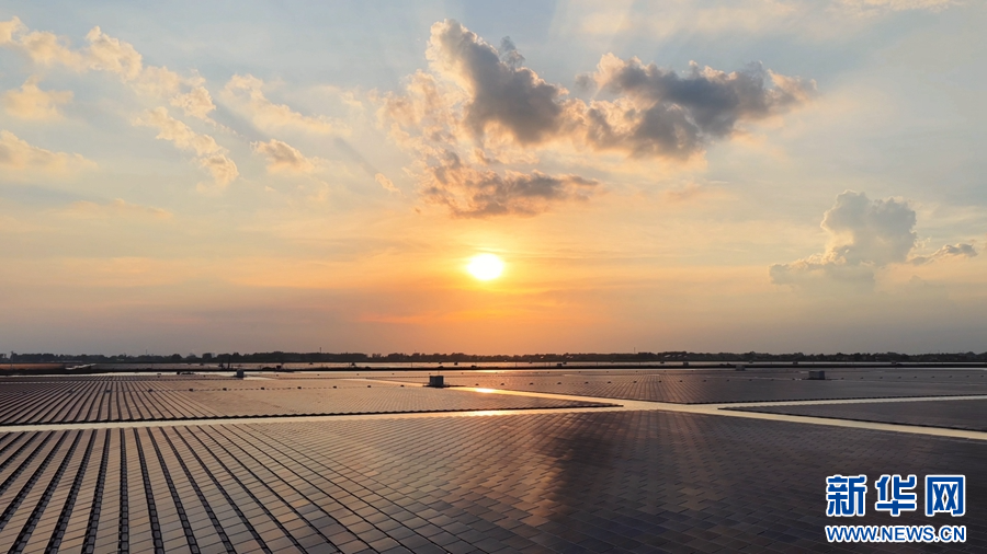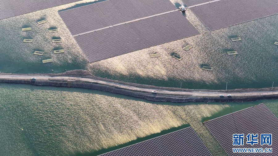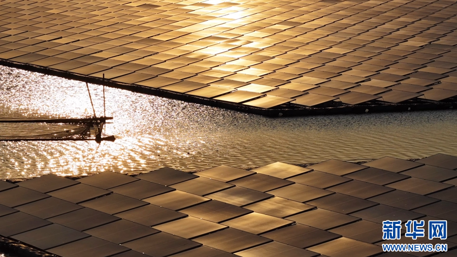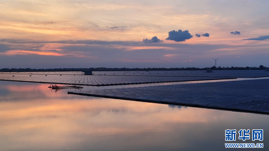 夏日时节,在安徽省颍上县的刘庄煤矿塌陷区,夕阳下的水上漂浮式光伏发电板熠熠生辉,蔚为壮观。