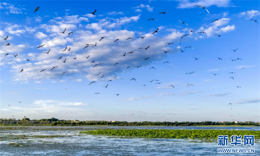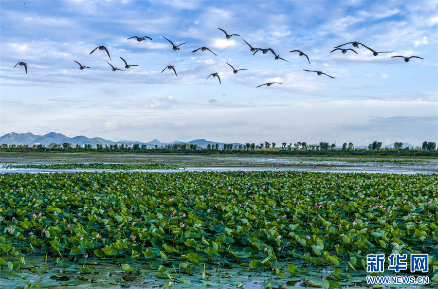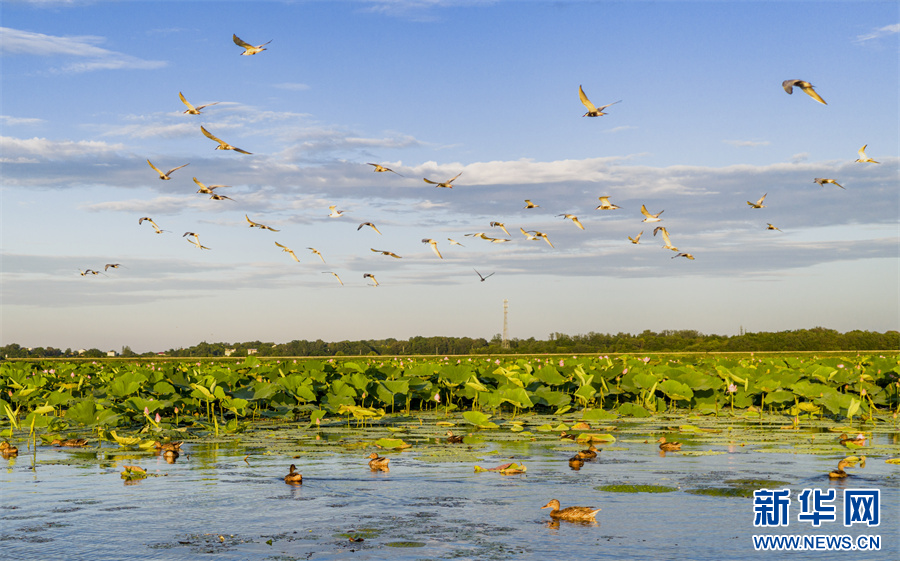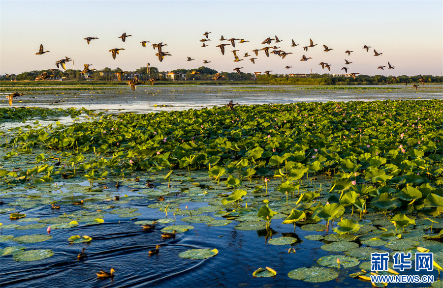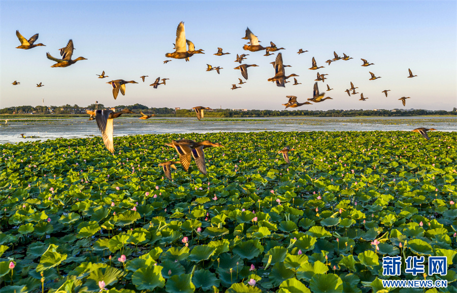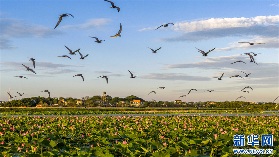 近日,安徽省合肥市庐江县黄陂湖湿地,荷花绽放,水鸟飞翔,呈现出一幅和谐的生态画卷。