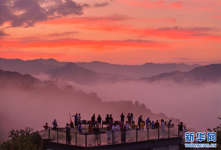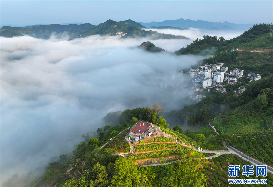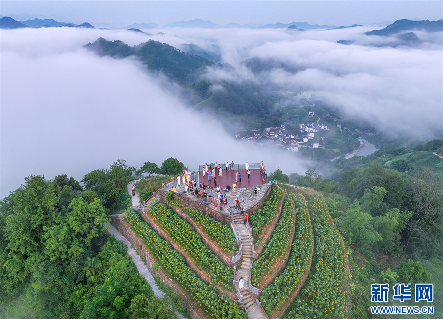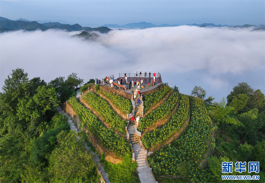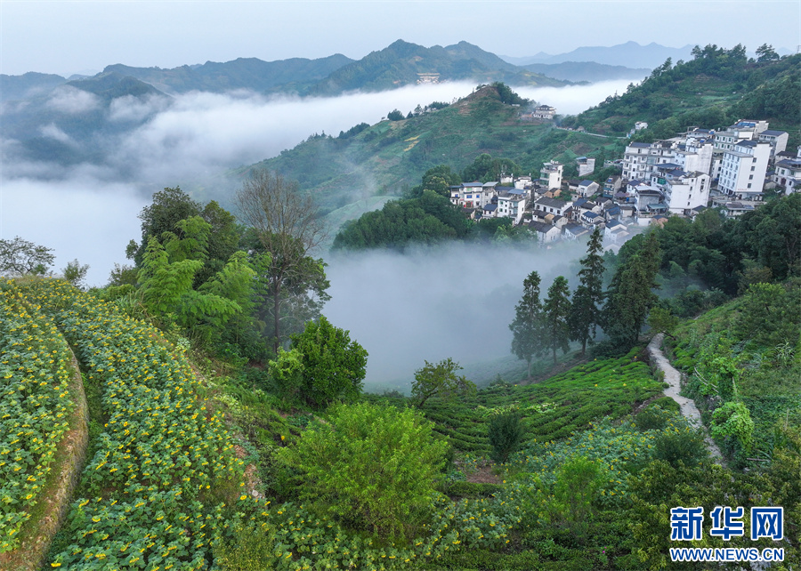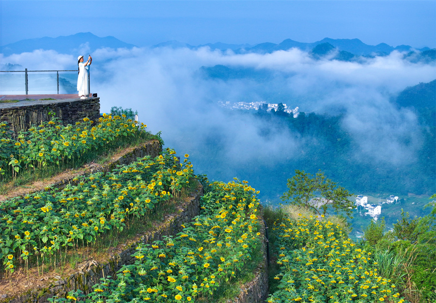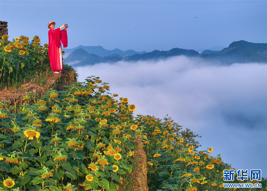 当日,雨后初霁的安徽省黄山市歙县霞坑镇石潭古村云海飘荡,盛开的向日葵和徽派民居遥相呼应,如诗如画,吸引众多游客前来游玩。新华网发(施亚磊 摄)