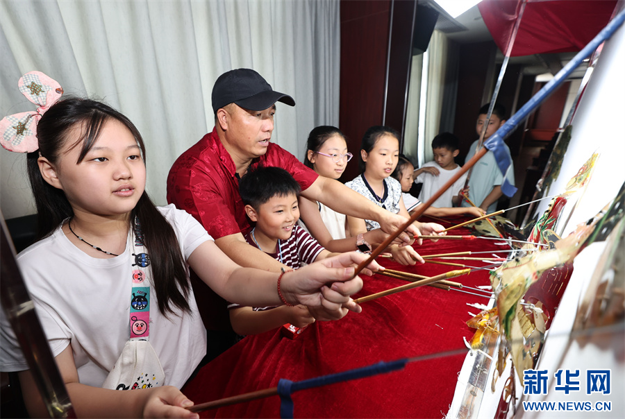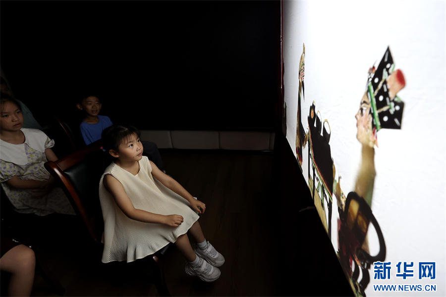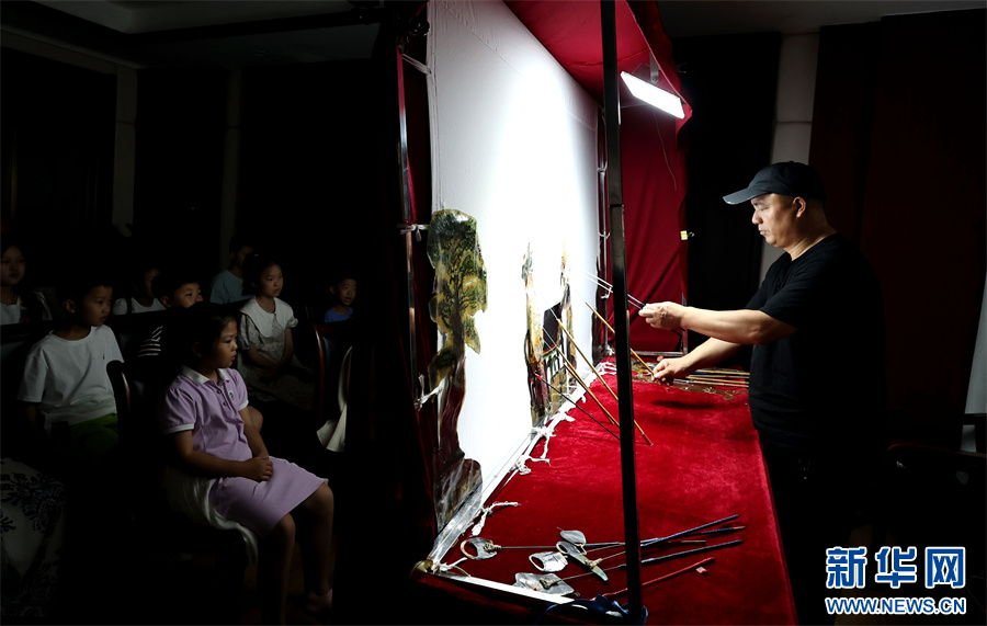 当日,安徽省淮北市总工会邀请非遗皮影戏传承人走进暑期儿童托管班,讲解皮影戏知识,表演皮影戏,让孩子们近距离接触皮影戏艺术,感受非遗文化的魅力。新华网发(张锋 摄)
