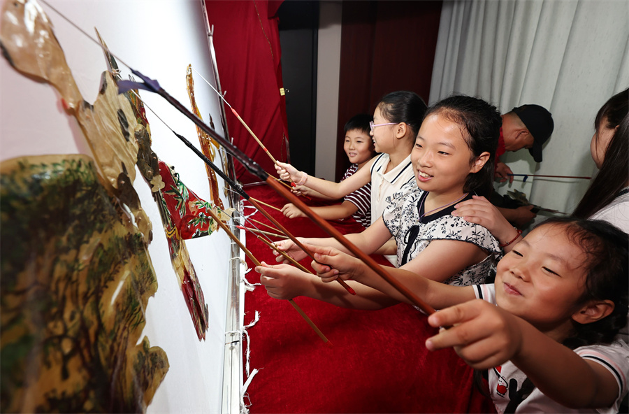 8月5日,安徽省淮北市非遗皮影戏传承人在给孩子介绍皮影戏知识。