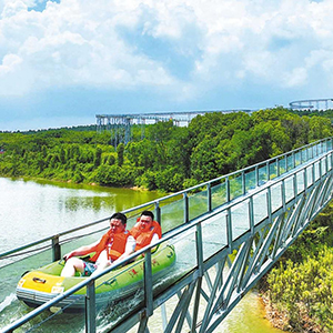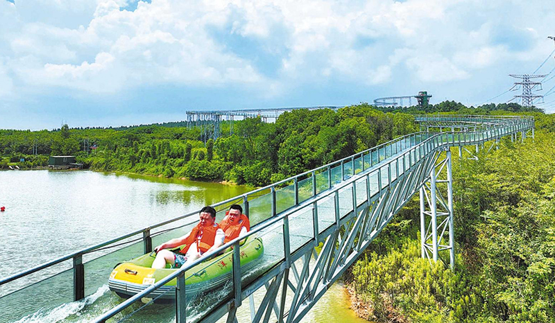 近日,游客在芜湖市湾沚区红杨镇洋滩河漂流景区玻璃滑道上感受夏日清凉。 吴琼 摄