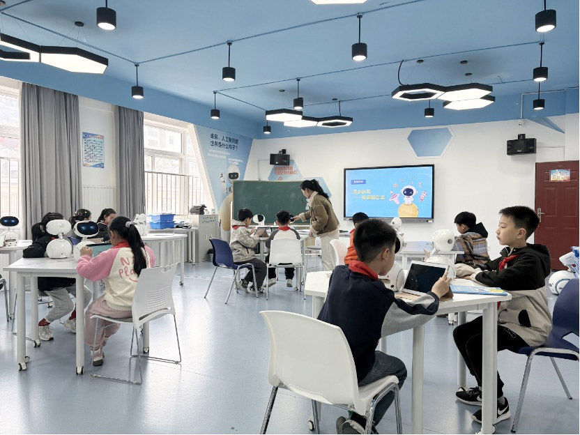 据校方介绍,智慧元素已贯穿教学全流程。以“二十年后的家乡”项目为例,在美术课堂让学生借助AI工具查询资料,在画纸上描绘家乡景象;再通过科学课堂,将画作科幻化;接着通过语文课堂,描绘家乡的未来场景,并借助AI生成相关图片;最后通过信息课堂,引导学生用编程制作出由机器人展示的宣传标语。