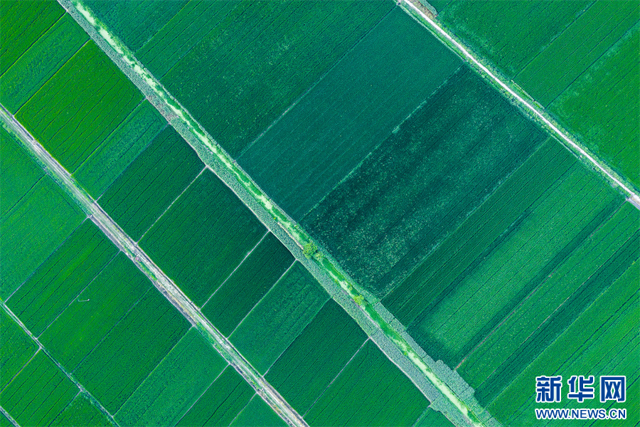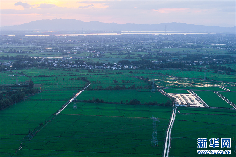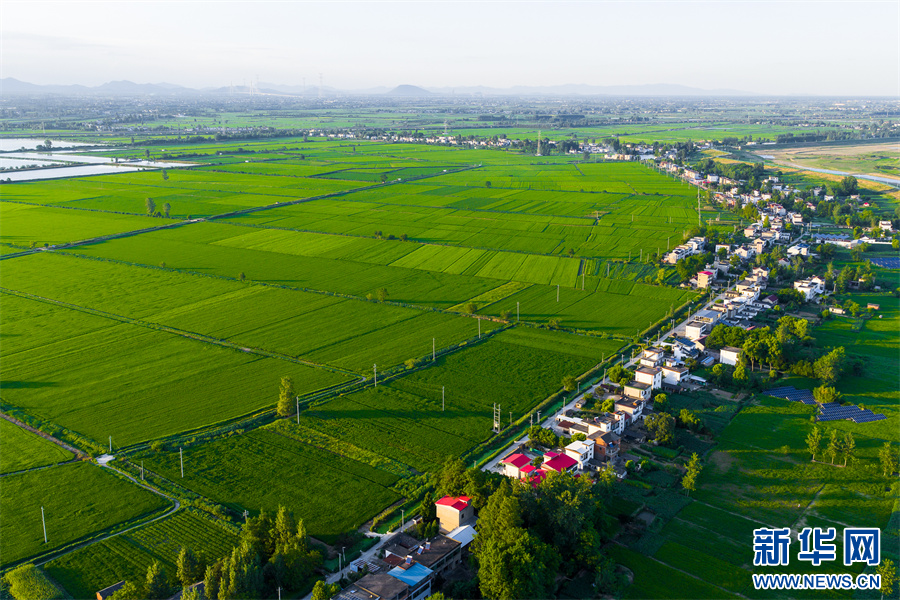 近日,安徽省池州市贵池区秋江街道新河村,葱郁田园与错落村舍、清澈河流、蜿蜒道路等相映成趣,构成了一幅诗意生态田园画卷。新华网发(饶治国 摄)