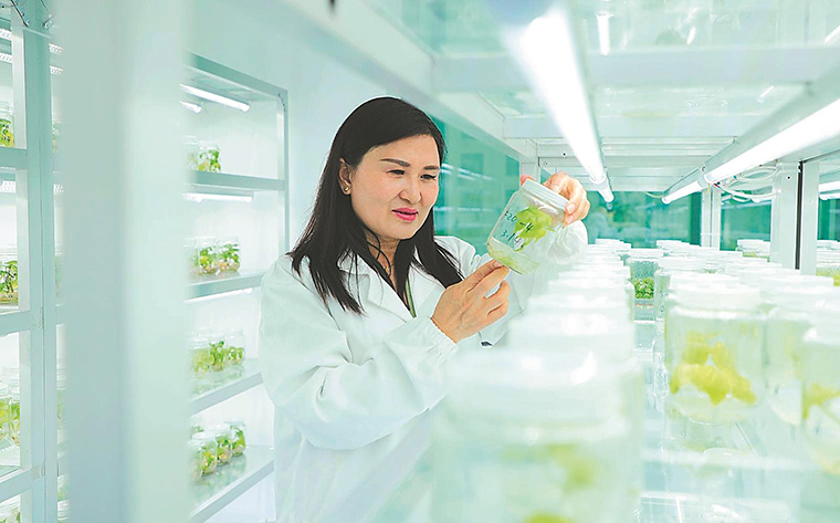 近日,在阜阳市农业科学院生物技术中心组织培养室内,技术人员在观察组培苗的生长情况。本报通讯员 宿飞 摄
