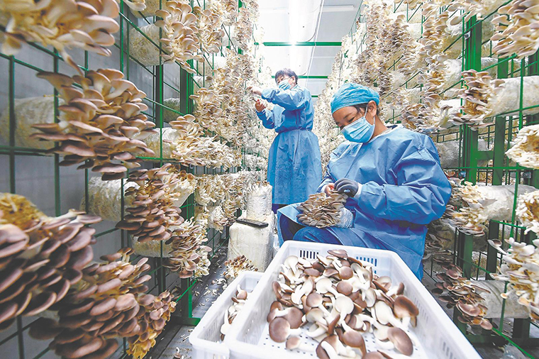 日前,在寿县的安徽春升新能源科技有限公司自主研发的食用菌智慧方舱,工作人员在采摘秀珍菇。本报记者 徐旻昊 张雨秋 摄