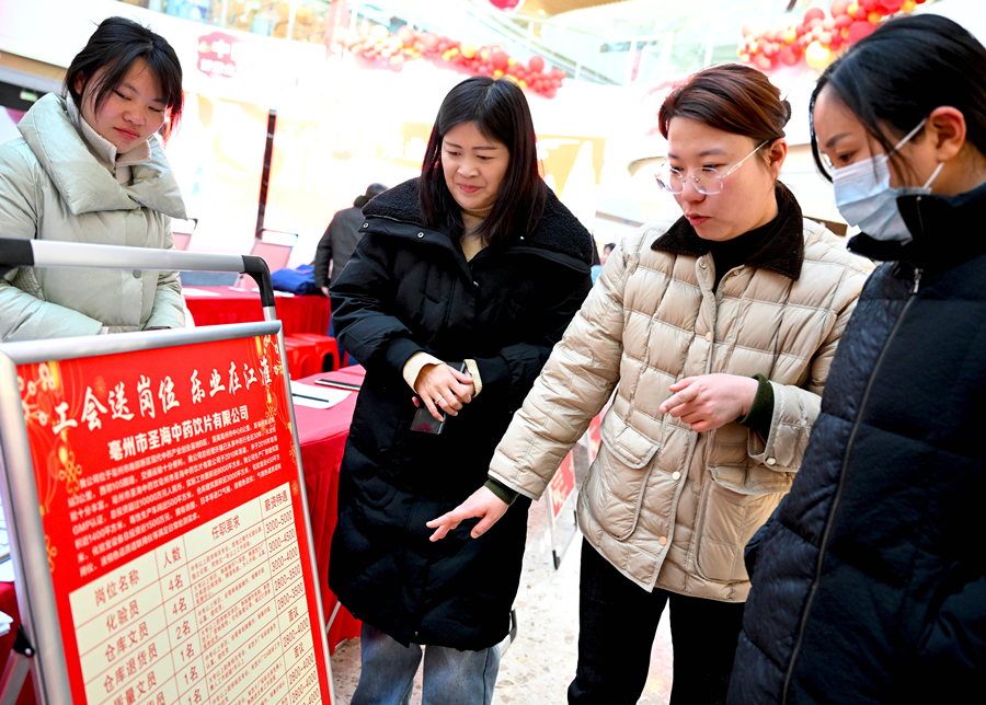2025年2月7日,求职者在安徽省亳州市谯城区举办的2025年“春风送岗就业援助专场招聘会”上了解招聘信息。新华社发(刘勤利 摄)