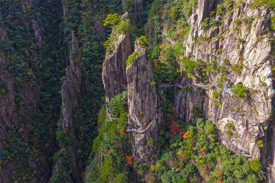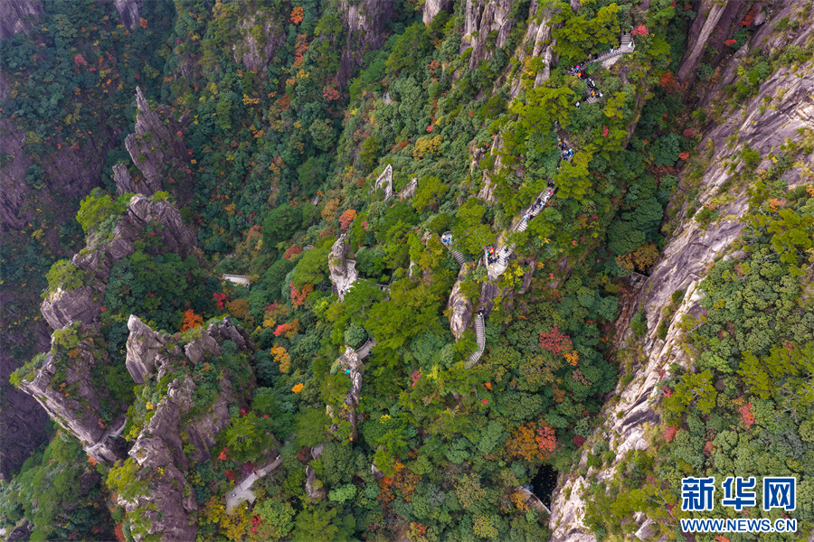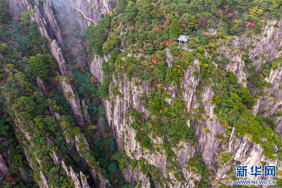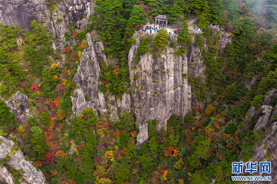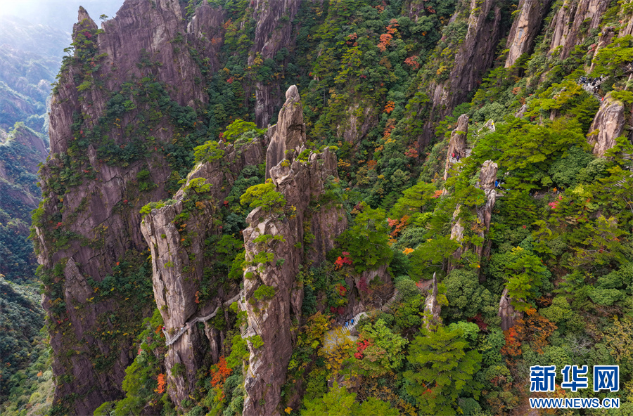 当日,安徽省黄山风景区西海大峡谷秋色绚烂,峰林间点缀着橙、红、黄交织的彩叶,与苍劲奇松、嶙峋怪石相映成趣,为雄伟的黄山增添诗意与柔情,引得游客驻足流连。新华网发(施亚磊 摄)