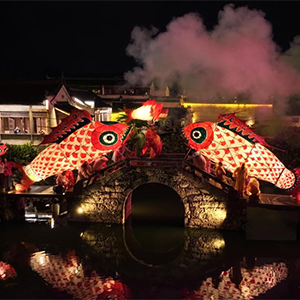 光影摇曳中,鱼灯舞动似游鱼戏水。璀璨的灯火与绚烂的烟花倒映在湖面,流光溢彩,唯美浪漫。众多游客沉浸其间,在互动中感受传统民俗的魅力。