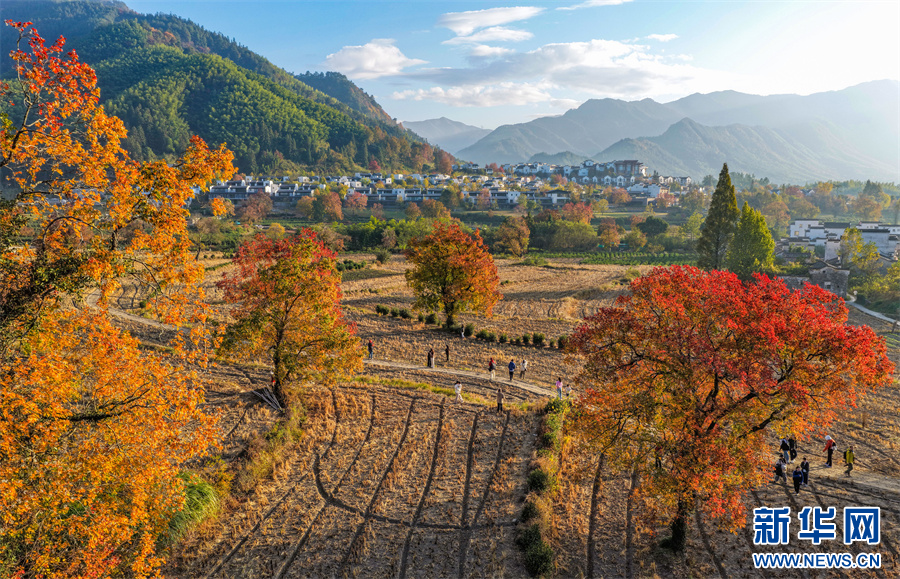 初冬时节,黟县宏村镇卢村晨雾缭绕,色彩绚丽的乌桕树与白墙黛瓦的徽派古村落交相辉映,构成一幅诗意盎然的乡村画卷,吸引众多游客前来观赏。新华网发(施亚磊 摄)
