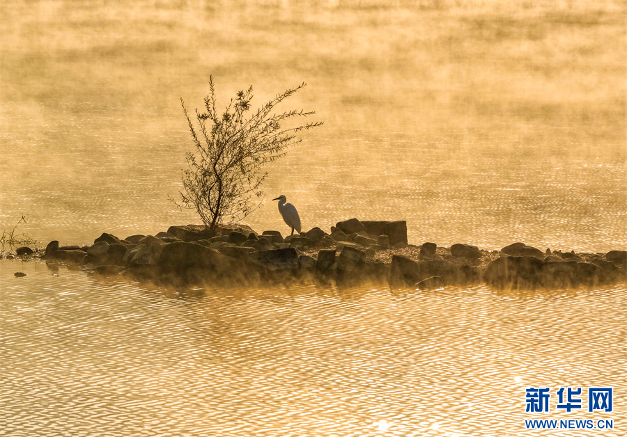 近日,游客在安徽省黄山市黟县宏村镇奇墅湖欣赏晨雾美景。当日,湖面水雾蒸腾,鎏金般的霞光洒在湖面上,熠熠生辉,游客徜徉其间,流连忘返。新华网发(施亚磊 摄)