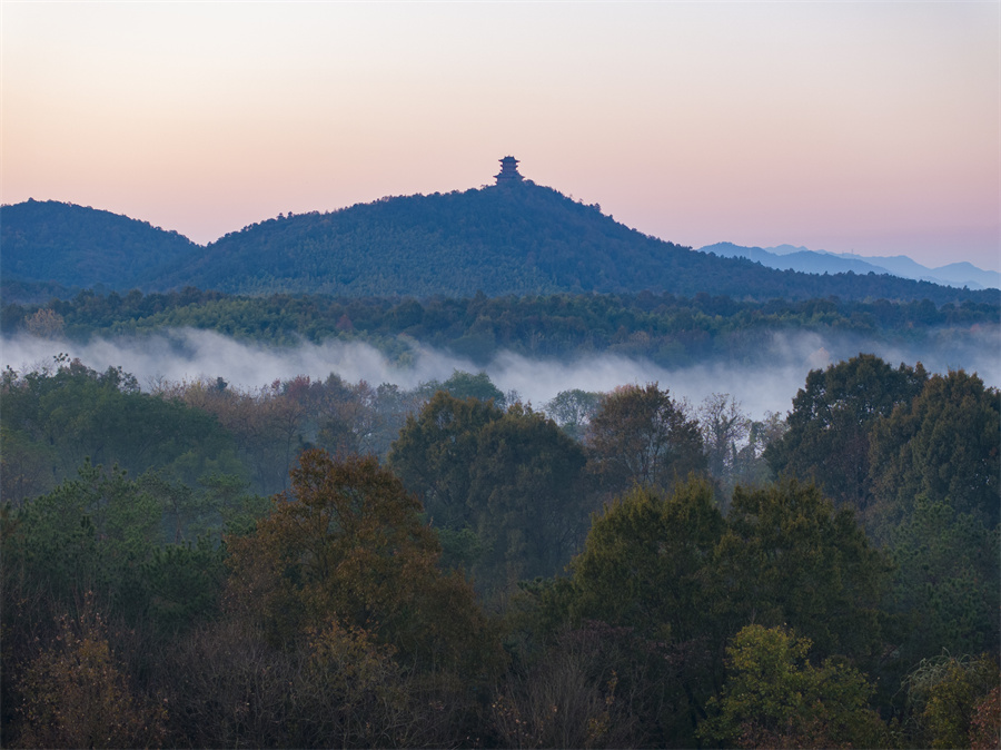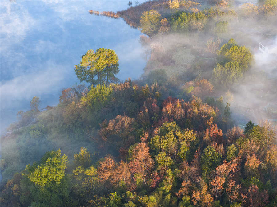 11月20日,池州市晨雾弥漫,山林五彩斑斓,绚丽多姿。