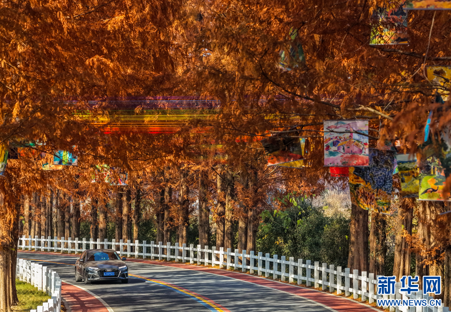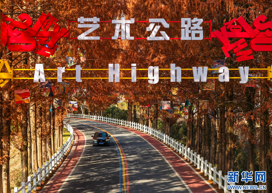 当日,安徽省黄山市休宁县齐云山镇的“艺术公路”两侧,成排的红杉树色彩缤纷,宛如一幅幅油画作品悬挂其间,车辆穿行而过,仿佛驶入一条天然的“流动画廊”,为游客带来“车行画中、人在景中”的旅行体验。