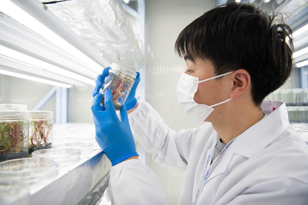 12月3日,在合肥神笔生物科技有限公司实验室内,研发人员苗良杰在查看组培苗的生长情况。新华社记者 张端 摄