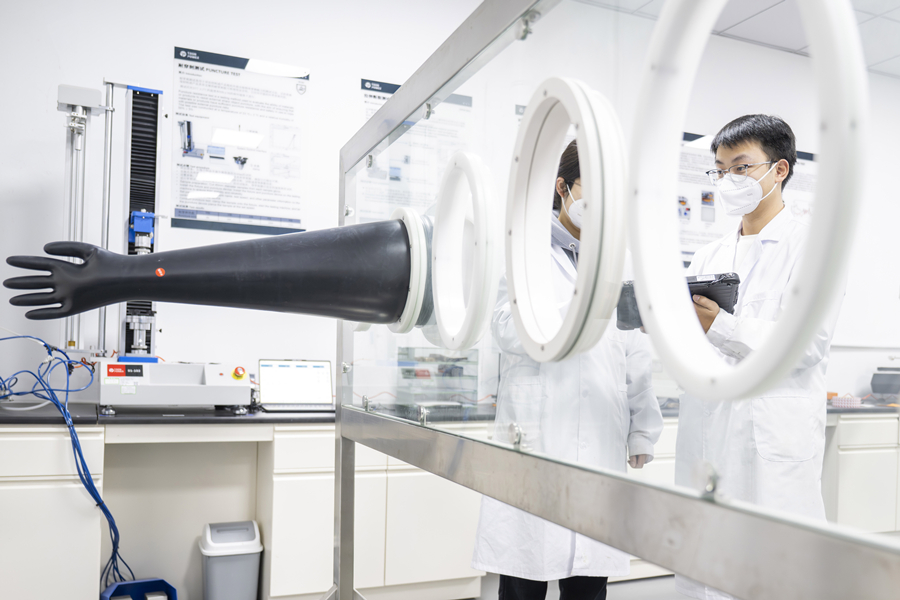 2025年12月17日,滁州乾钼智能制造有限责任公司,实验室技术人员正在对生产的防护手套进行检测。新华网发(计成军 摄)